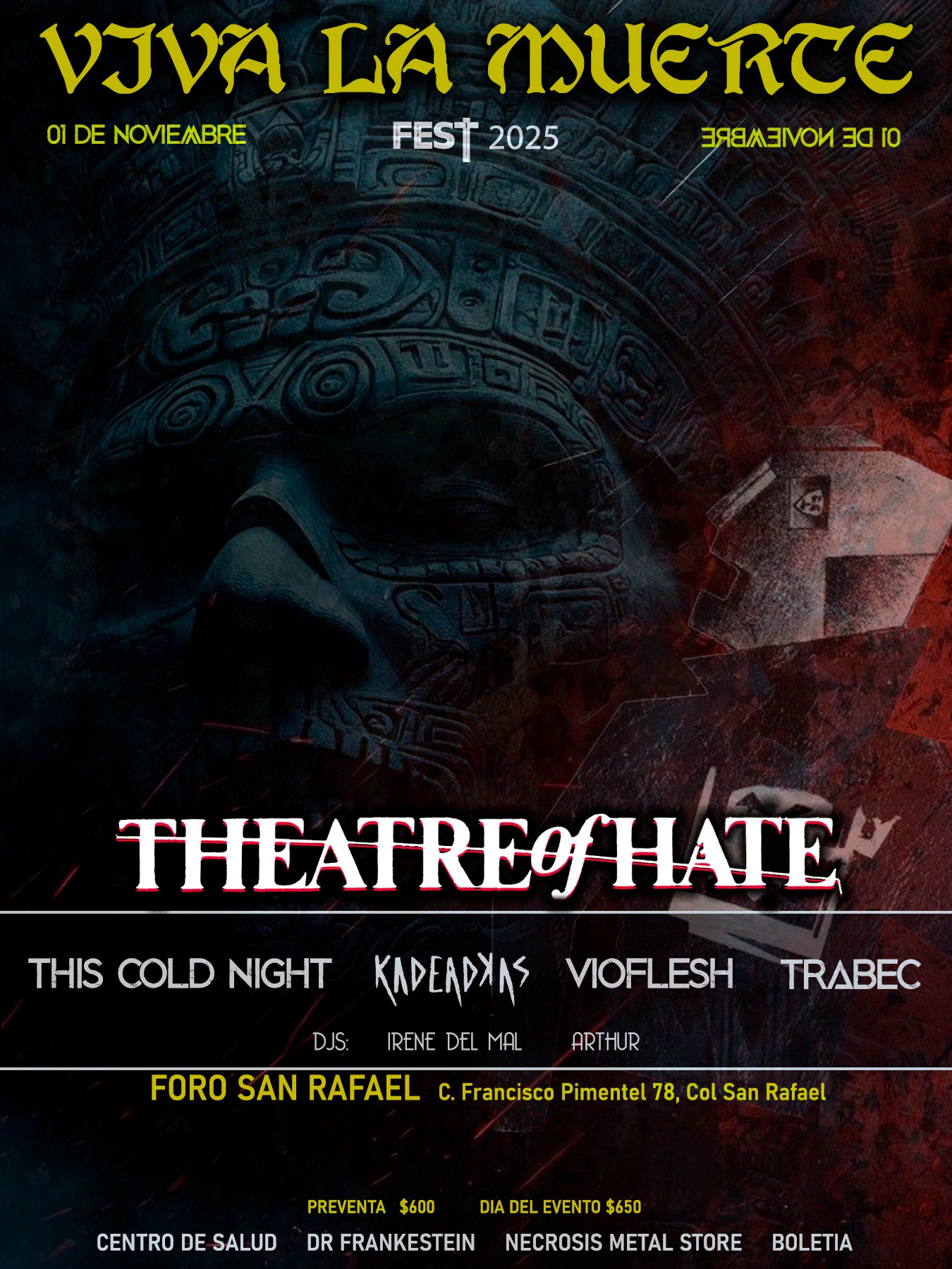de este año, como ya muchos saben nos acompañara los legendarios THEATRE OF HATE como cabeza de cartel, un sueño hecho realidad y que esperamos disfruten los asistentes al evento. también nos acompaña el talento de THIS COLD NIGHT, KADEADKAS Y VIOFLESH. en la selección de música tendremos a ARTHUR + IRENE del mal, los visuales correrán a cargo del buen amigo ZOONOSIS, todo esta listo, los boletos ya se empezaron a vender y como ya se dijo antes, el lugar es mas pequeño así que hay una cantidad limitada de boletos a la venta, el VIVA LA MUERTE FEST esta a 1 mes y nosotros ya estamos listos...
